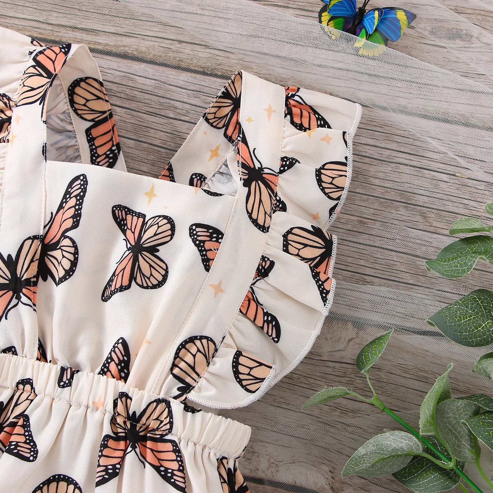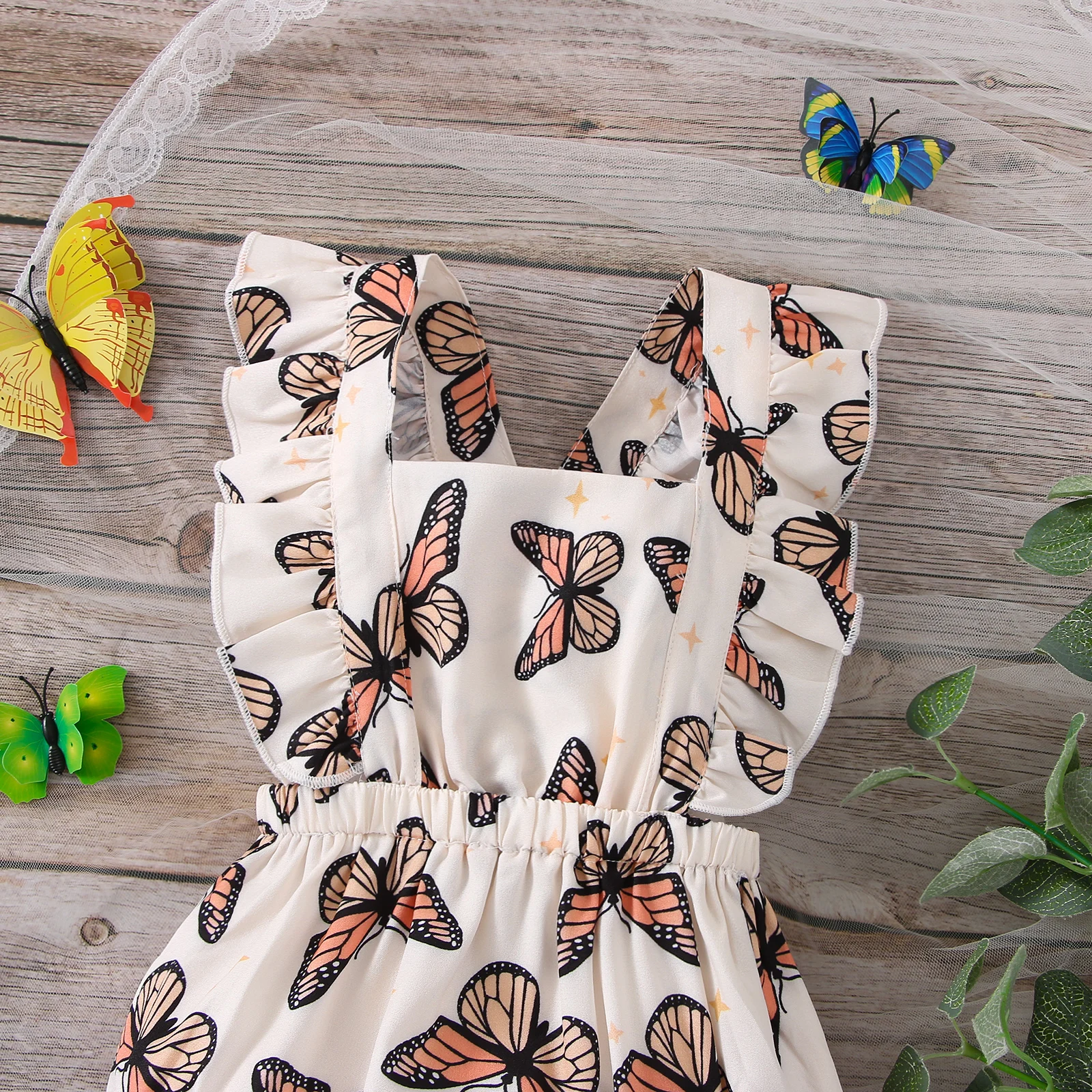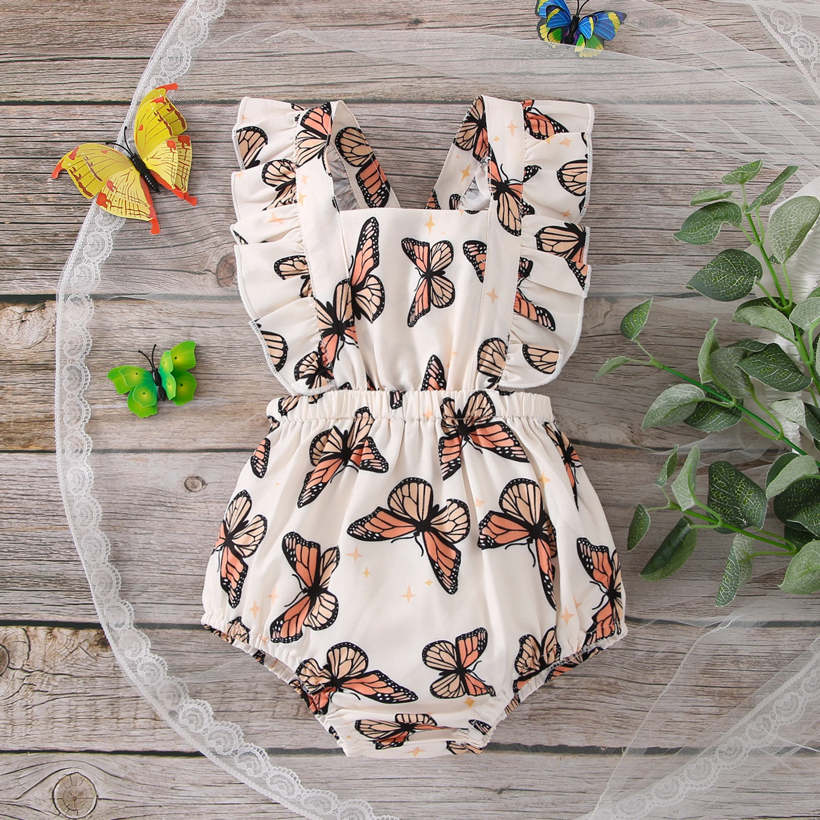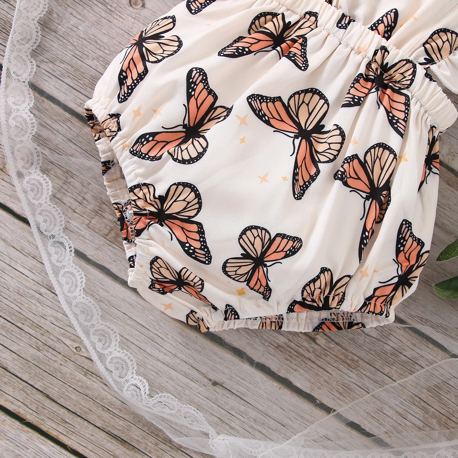 Baby Butterfly Print Ruffle Trim Square Neck Crisscross Back Bodysuit