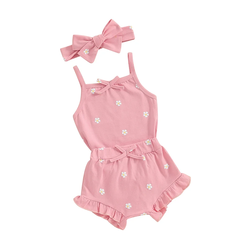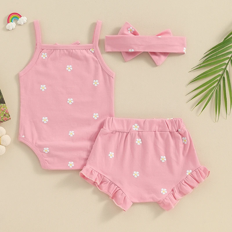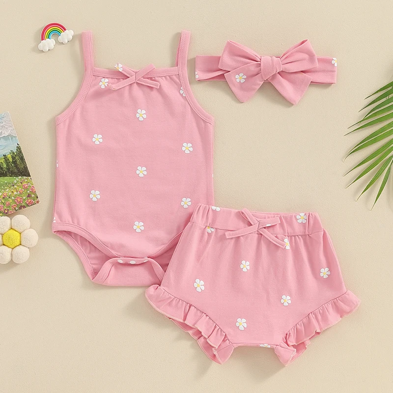 Baby Girls 3Pcs Summer Outfit Sleeveless Bow Romper + Ruffle Shorts + Headband Set Newborn Clothes