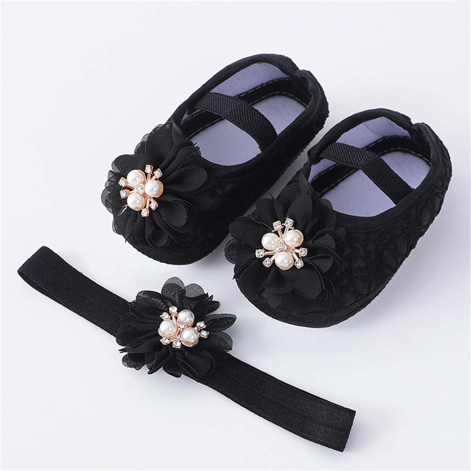 Baby Girls Flats and Headband Soft Sole Non-slip Pearl Flower Princess Wedding Dress Walking Shoes for Newborn