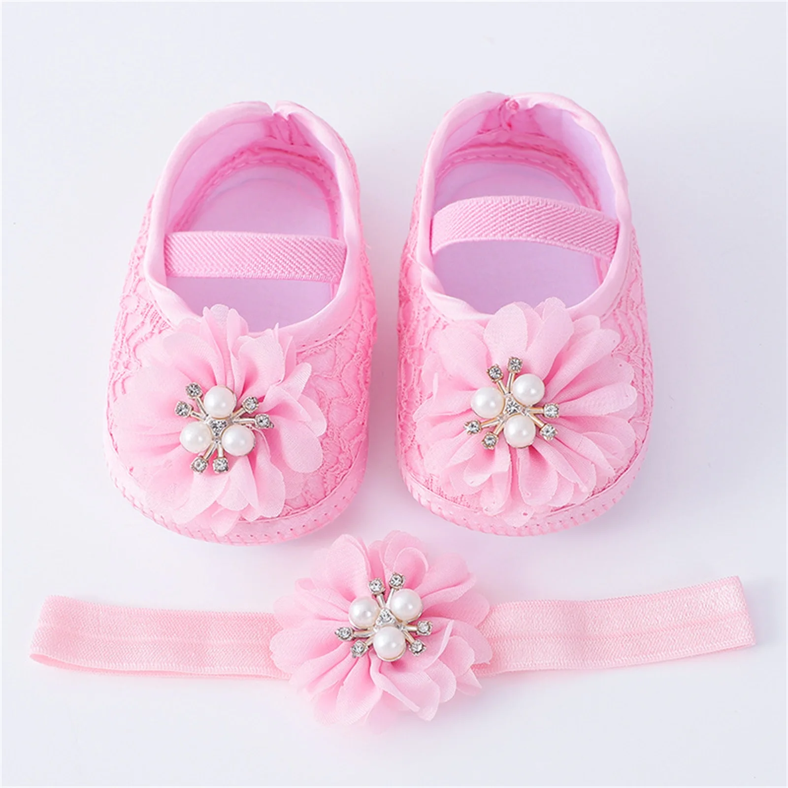 Infant Baby Girls Flats and Headband Soft Sole Non-slip Pearl Flower Princess Wedding Dress Walking Shoes for Newborn