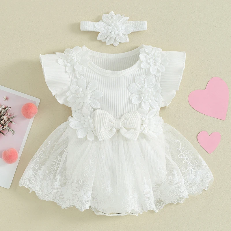 Newborn Baby Girl Romper Dress Short Sleeve Mesh Tutu Dress Baby Girls Lace Mesh Dress Jumpsuits with Headband