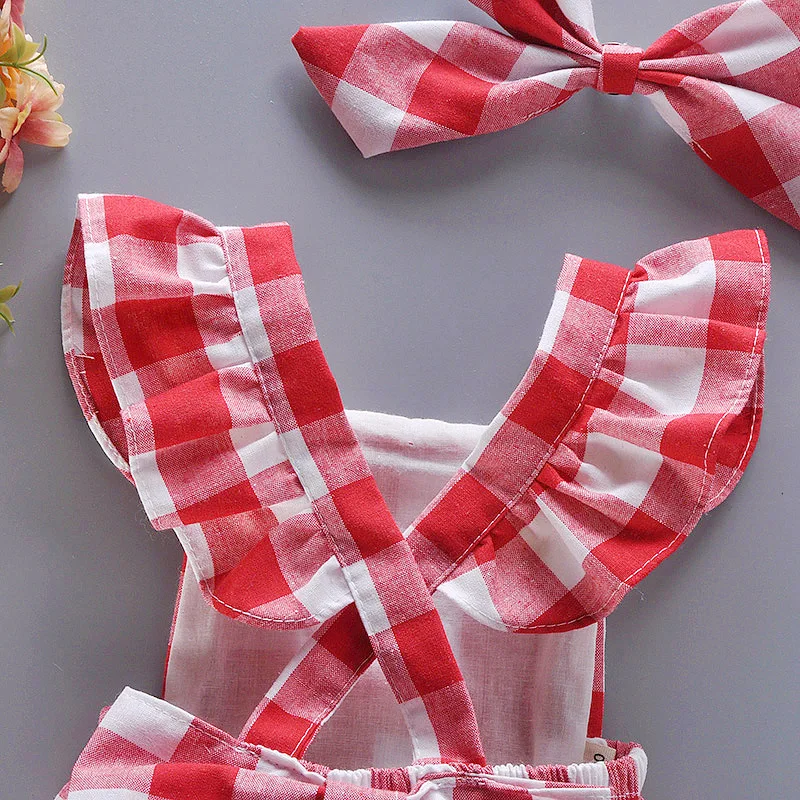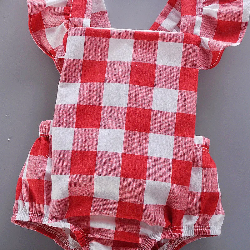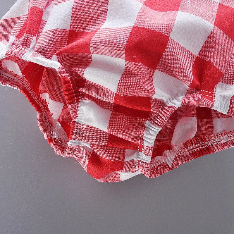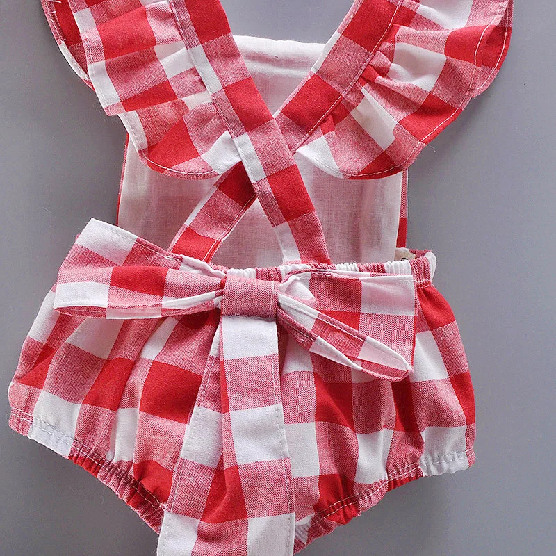 Newborn Summer Comfortable Crawling Clothes With Red Checkered Flying Sleeves Big Bow Wrapped Bottom Coat Suitable For 0-2 Year